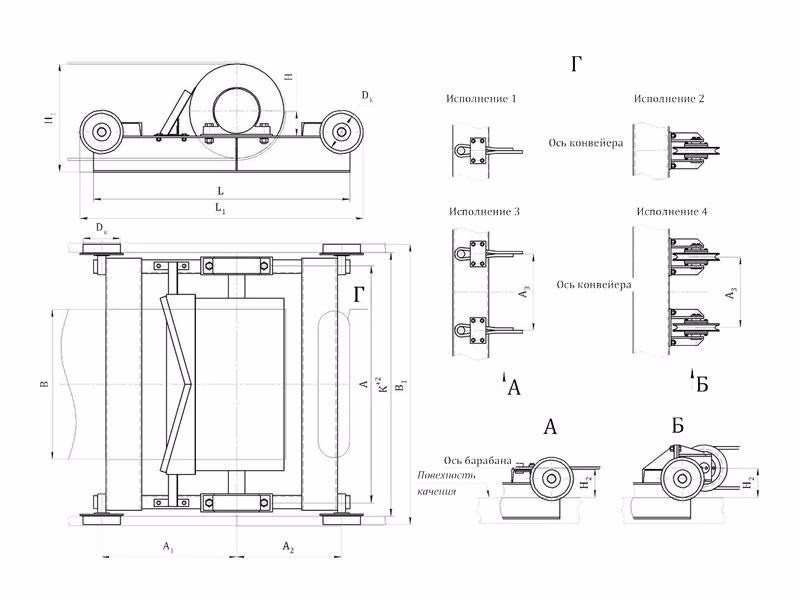 Пример условного обозначения тележки натяжной грузовой для конвейера шириной ленты В=1000 мм, с барабаном 500 мм, внутренним диаметром подшипника 80: